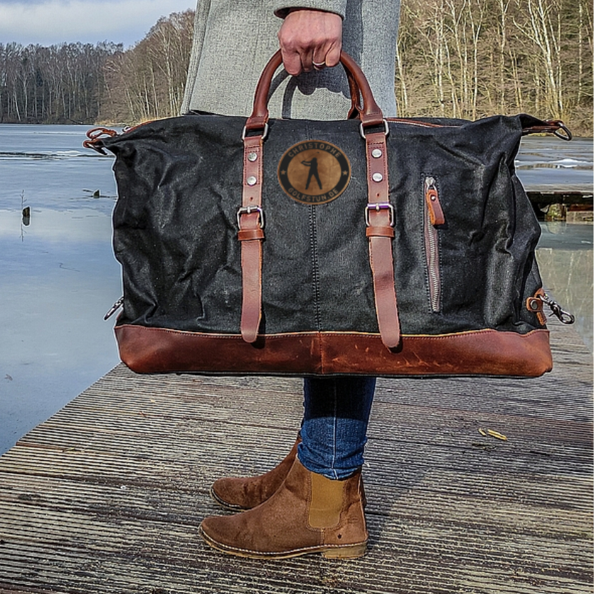 Hochwertige Freizeittasche aus gewachster Baumwolle mit Lederapplikationen für Golferinnen und Golfer. Du kannst zwischen zwei Motiven wählen und die Tasche zusätzlich personalisieren.